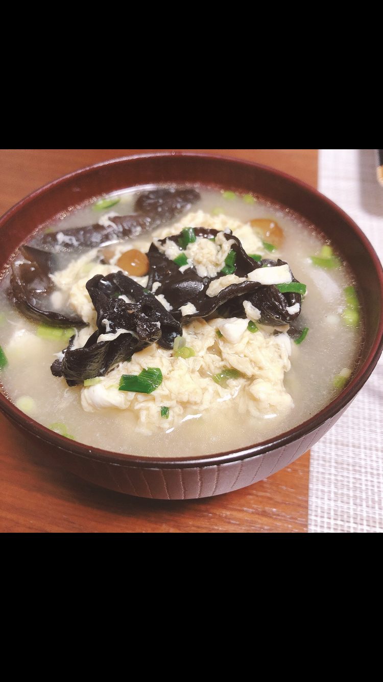 豆腐1/2丁、卵1個、なめこ、小ネギ、キクラゲ