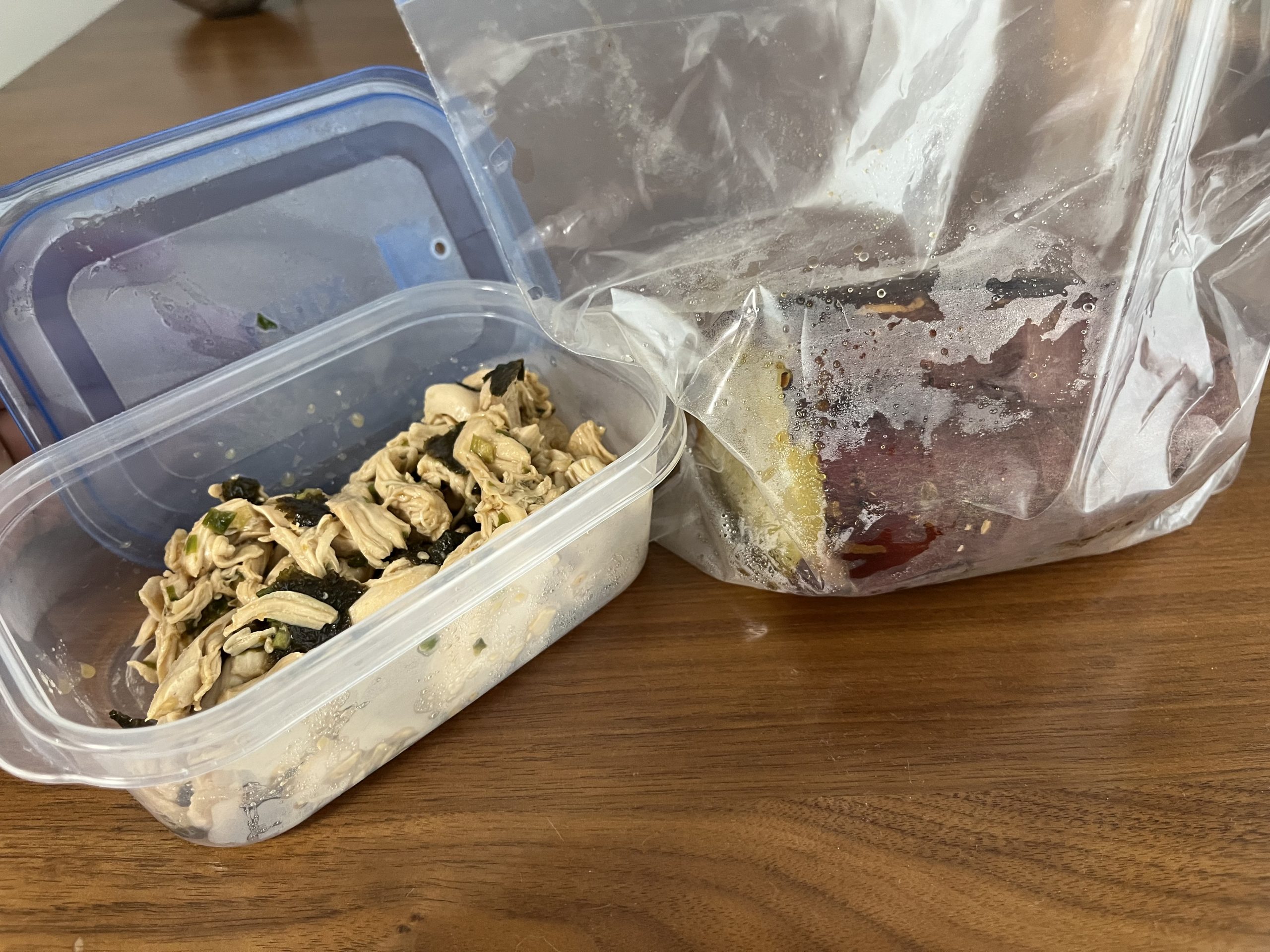 茹でたササミを細かく割いて鶏ガラや酢、醤油、ニンニクチューブなどを入れた米が進むような味とのこと👍
